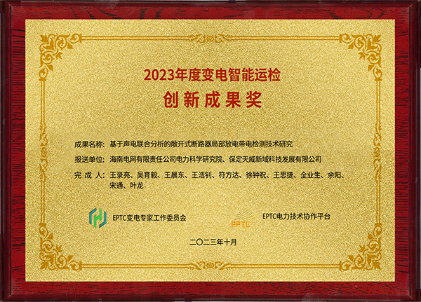 10月26-27日,由EPTC电力技术协作平台联合国网江苏省电力有限公司主办的2023年(第八届)变电智能运检创新发展论坛在江苏省苏州市盛大召开。德赢vwin8868官网新域联合海南电科院共同研发的“基于声电联合分析的敞开式断路器局部放电带电检测技术研究”获得2023年度变电智能运检创新成果奖。