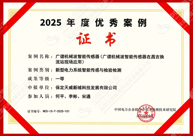 2025年9月,保定德赢vwin8868官网新域科技发展有限公司申报的“广谱机械波智能传感器(广谱机械波智能传感器在昌吉换流站现场应用)获评由中国电力企业联合会电力检测技术研究院发布的新型电力系统智能传感与检验检测新技术、新产品、新场景及典型应用案例一等奖。