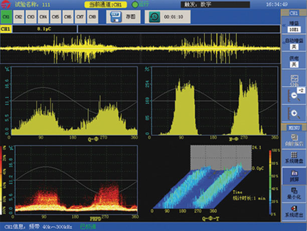 3、具有实时脉冲波形和统计图谱,既可详查分析某个相位脉冲,对该脉冲进行频谱分析,分析放电脉冲的频谱含量,也可以PRPS、PRPD、Q-N等图谱进行统计分析;